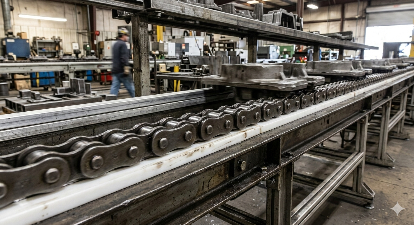 Our wear strips in action here at one of the many power plants we provide protecting the chain conveyor from any damage.